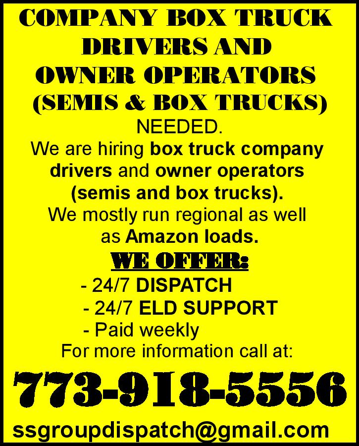 COMPANY BOX TRUCK DRIVERS NEEDED AND OWNER OPERATORS (SEMIS AND BOX TRUCKS) We are hiring box truck company drivers and owner operators (semis and box trucks). We mostly run regional as well as Amazon loads. WE OFFER: - 24/7 DISPATCH - 24/7 ELD SUPPORT - Paid weekly For more informatio […]