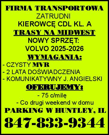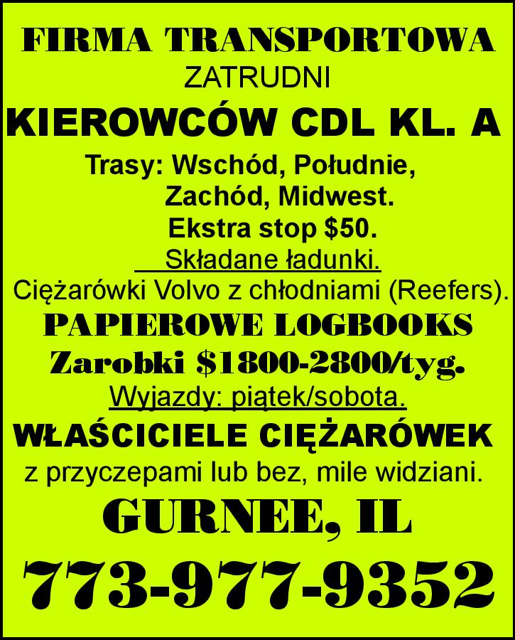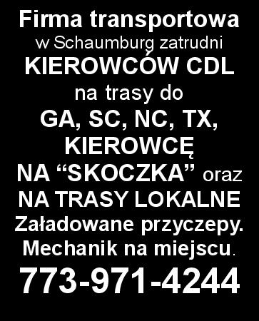 Firma transportowa z Bensenville, IL zatrudni KIEROWCÓW CDL KL. A NA TRASY DO 350 MIL , NA TRASY LOKALNE oraz DO PRACY LOKALNEJ Praca 4 lub 5 dni w tygodniu. Codziennie w domu. Bardzio dobre zarobki. WŁASCICIELE CIĘŻARÓWEK & MECHANIK DO NAPRAWY CIĘŻARÓWEK I PRZYCZEP potrzebnI. 630-768-7755
