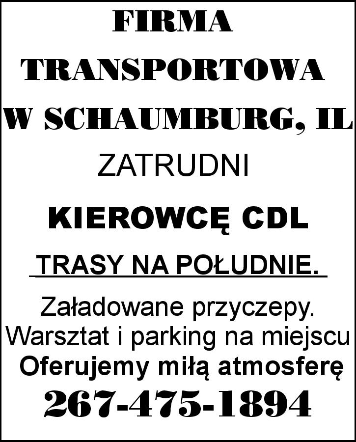 FIRMA TRANSPORTOWA W SCHAUMBURG, IL ZATRUDNI KIEROWCĘ CDL TRASY NA POŁUDNIE. Załadowane przyczepy. Warsztat i parking na miejscu. Oferujemy miłą atmosferę. 267-475-1894