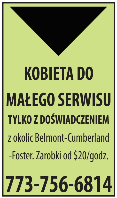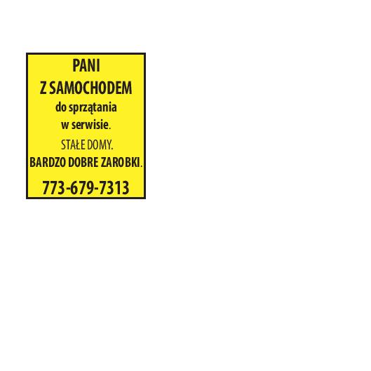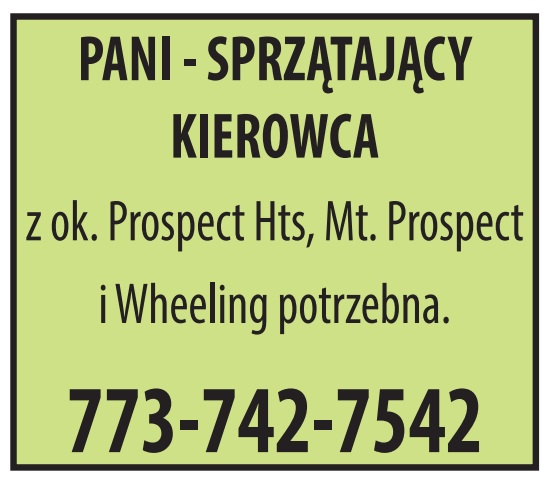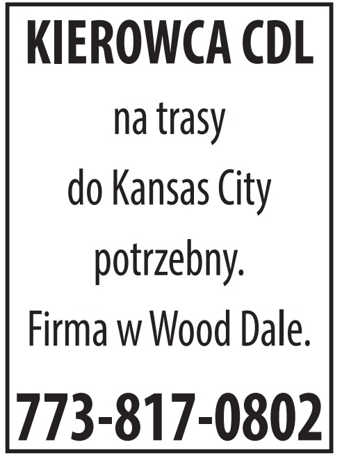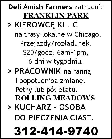 FRANKLIN PARK > KIEROWCĘ KL. C na trasy lokalne w Chicago. Przejazdy/rozładunek. $20/godz. 6am-1pm, 6 dni w tygodniu. > PRACOWNIK na ranną i popołudnioą zmianę. Pełny lub pół etatu. ROLLING MEADOWS > KUCHARZ - OSOBA DO PIECZENIA CIAST. 312-414-9740