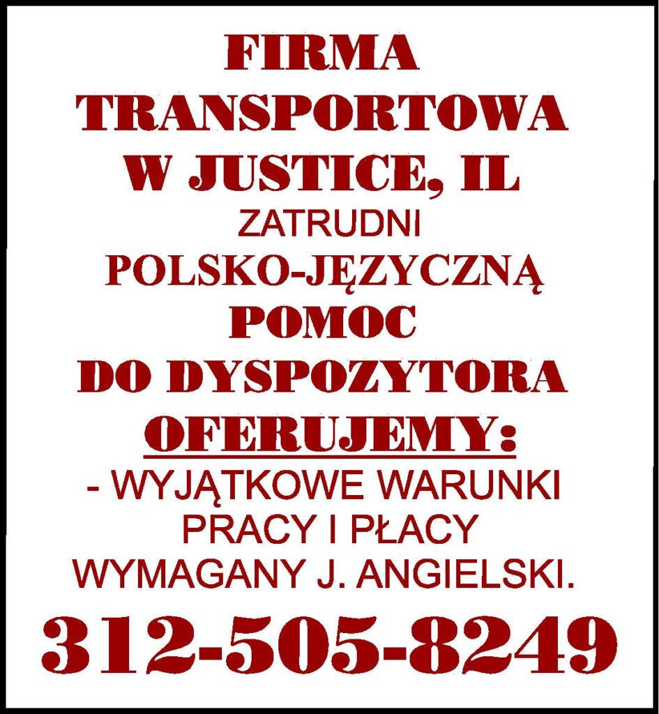 FIRMA TRANSPORTOWA W JUSTICE, IL ZATRUDNI POLSKO-JĘZYCZNĄ POMOC DO DYSPOZYTORA. OFERUJEMY: - WYJĄTKOWE WARUNKI PRACY I PŁACY WYMAGANY J. ANGIELSKI. 312-505-8249