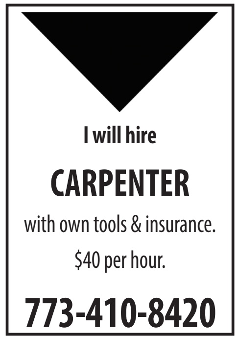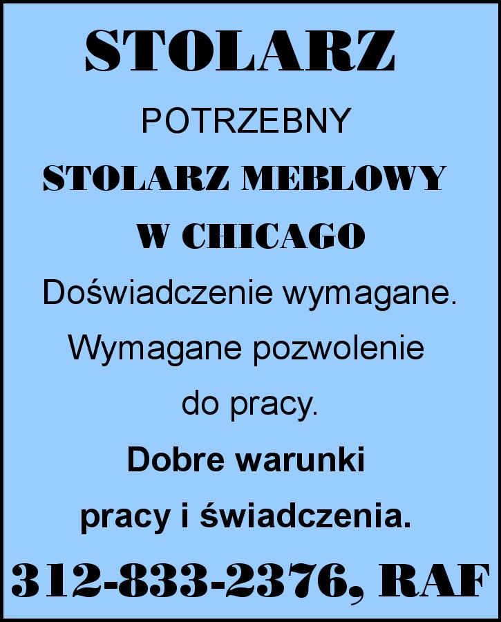 POTRZEBNY STOLARZ MEBLOWY W CHICAGO. Doświadczenie wymagane. Wymagane pozwolenie do pracy. Dobre warunki pracy i świadczenia. 312-833-2376, RAF