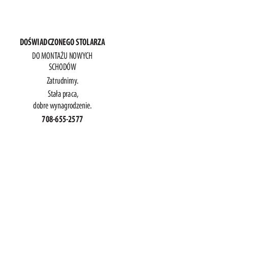 DOŚWIADCZONEGO STOLARZA DO MONTAŻU NOWYCH SCHODÓW Zatrudnimy. Stała praca, dobre wynagrodzenie. 708-655-2577
