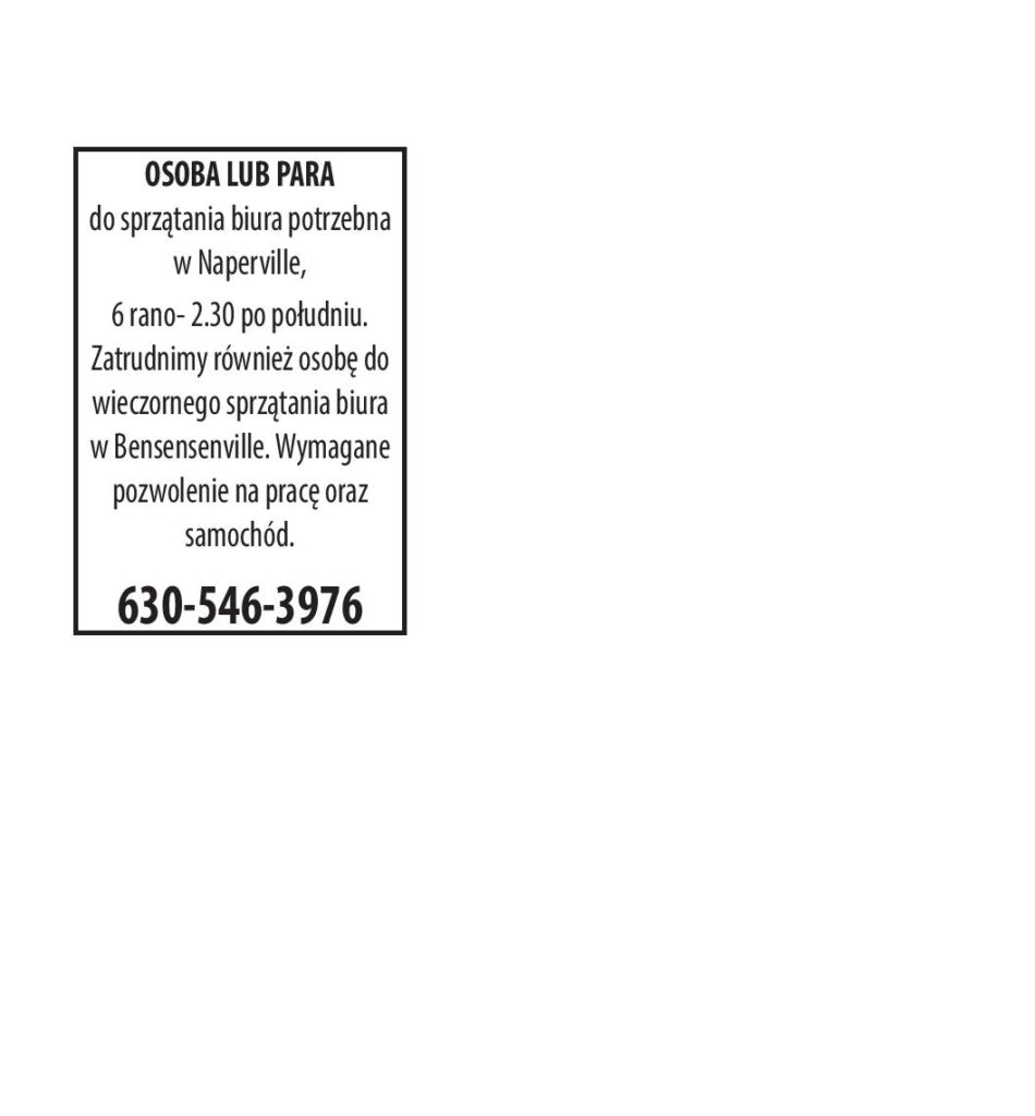 OSOBA LUB PARA do sprzątania biura potrzebna w Naperville, 6 rano- 2.30 po południu. Zatrudnimy również osobę do wieczornego sprzątania biura w Bensensenville. Wymagane pozwolenie na pracę oraz s […]