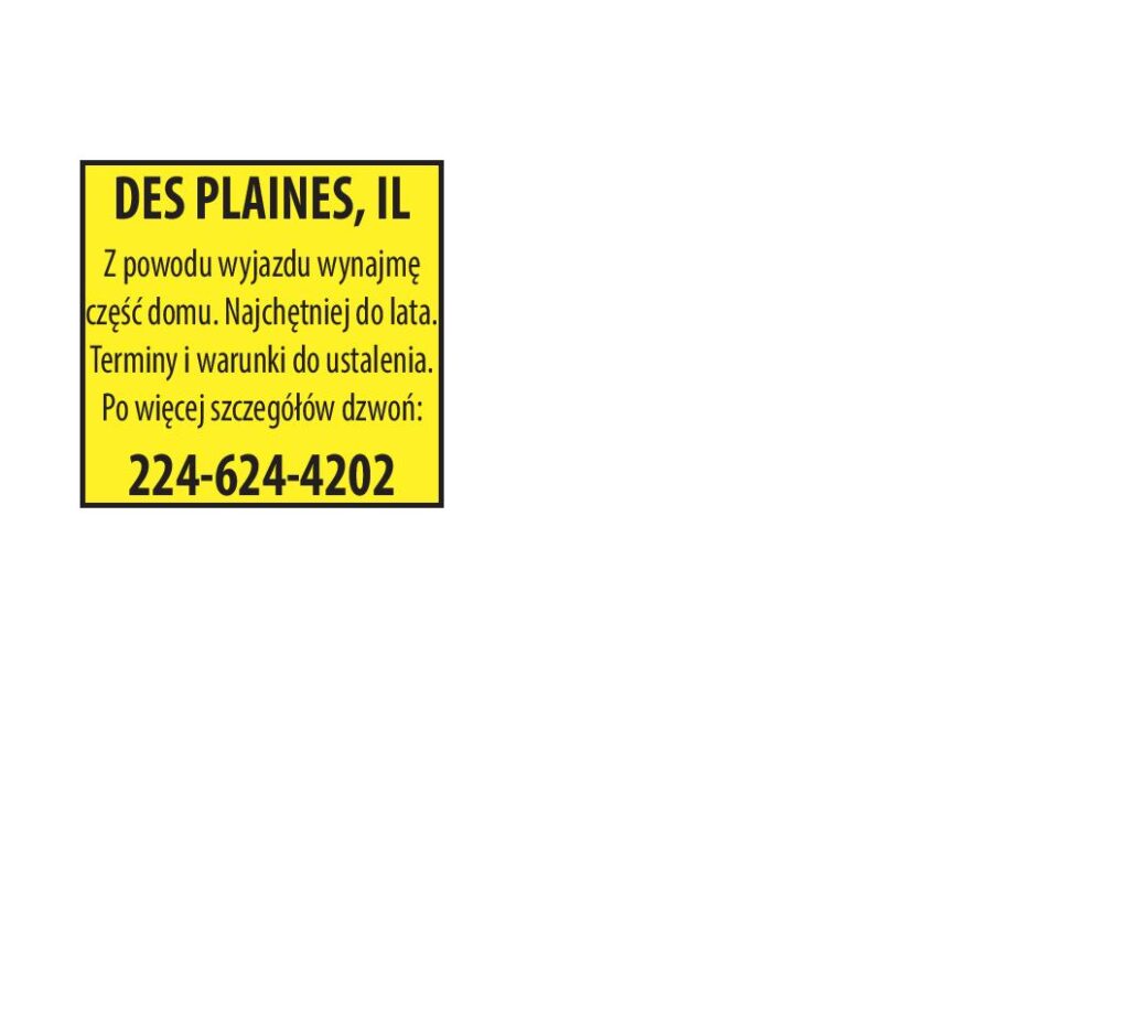 DES PLAINES, IL Z powodu wyjazdu wynajmę część domu. Najchętniej do lata. Terminy i warunki do ustalenia. Po więcej szczegółów dzwoń: 224-624-4202