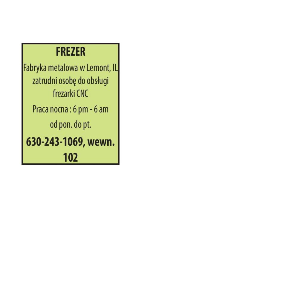 FREZER Fabryka metalowa w Lemont, IL zatrudni osobę do obsługi frezarki CNC Praca nocna : 6 pm - 6 am od pon. do pt. 630-243-1069, wewn. 102