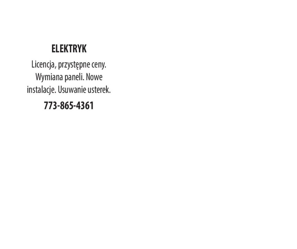 FIRMA ELEKTRYCZNA MGD ELECTRIC ZATRUDNI ELEKTRYKÓW I POMOCNIKÓW Z MIN. 2-LETNIM DOŚWIADCZENIEM W USA. Proszę dzwonić od poniedziałku do piątku, w godz. 7 am - 5 pm. 773-283-3320