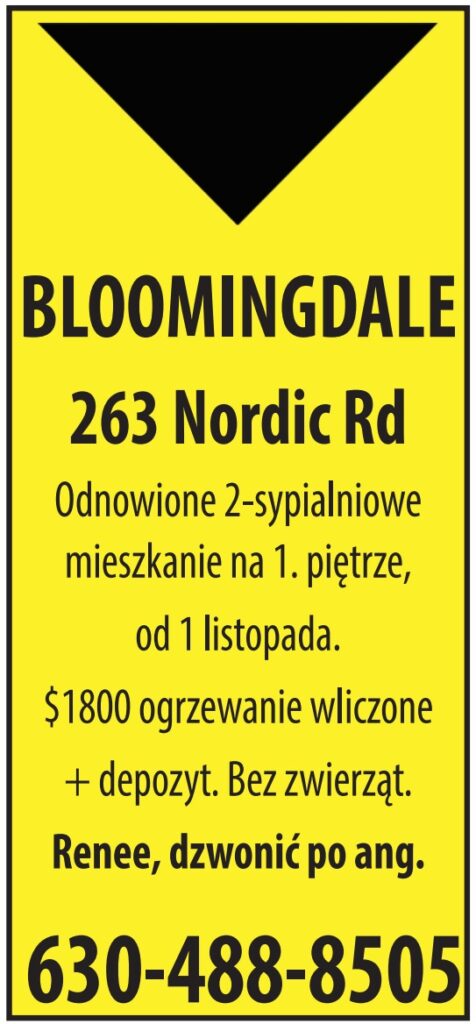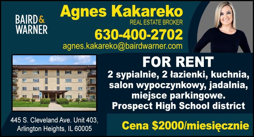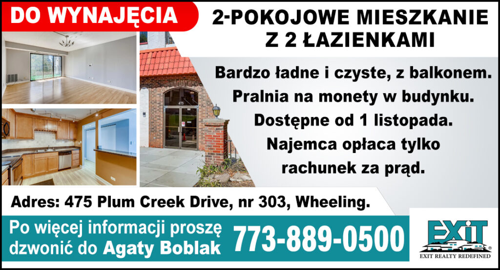 Do wynajęcia: 2-pokojowe mieszkanie z 2 łazienkami, bardzo ładne i czyste, z balkonem. Pralnia na monety w budynku. Dostępne od 1 listopada. Najemca opłaca tylko rachunek za prąd. Adres: 475 Plum Creek Drive, nr 303, Wheeling. Po więcej informacji proszę dzwonić do Agaty Boblak pod numer […]