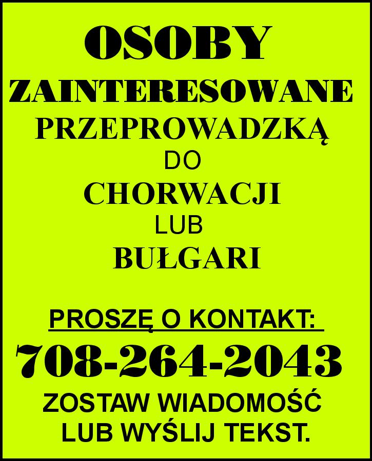 OSOBY ZAINTERESOWANE PRZEPROWADZKĄ DO CHORWACJI LUB BUŁGARI PROSZĘ O KONTAKT: 708-264-2043 ZOSTAW WIADOMOŚĆ LUB WYŚLIJ TEKST.