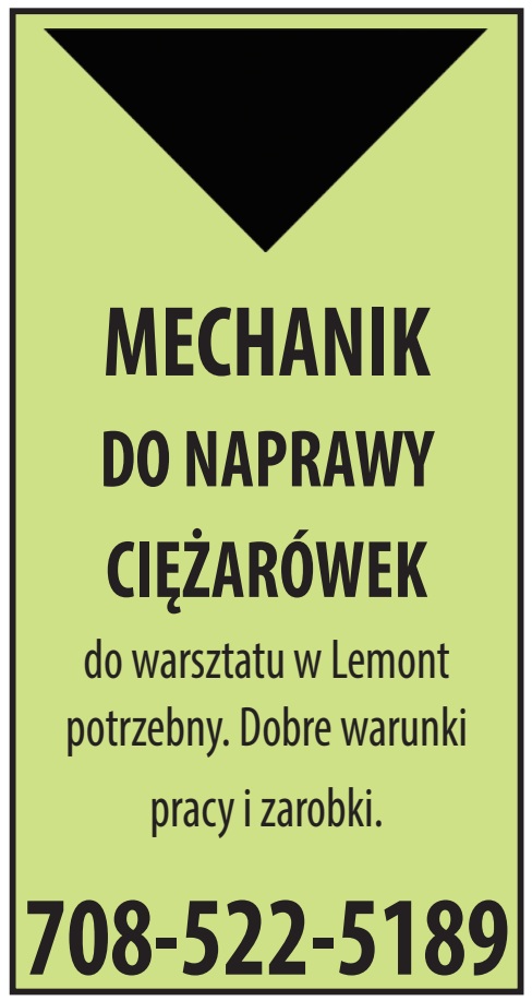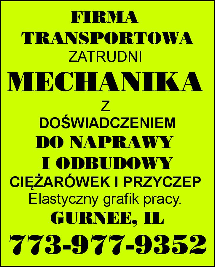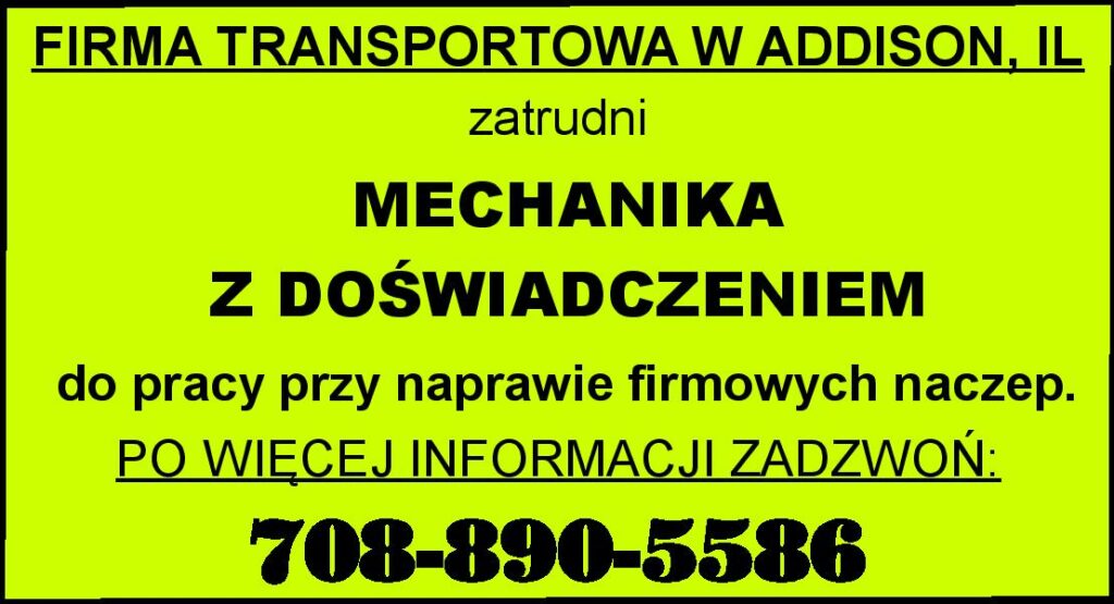FIRMA TRANSPORTOWA W ADDISON, IL zatrudni MECHANIKA Z DOŚWIADCZENIEM do pracy przy naprawie firmowych naczep. Po więcej informacji zadzwoń: 708-890-5586