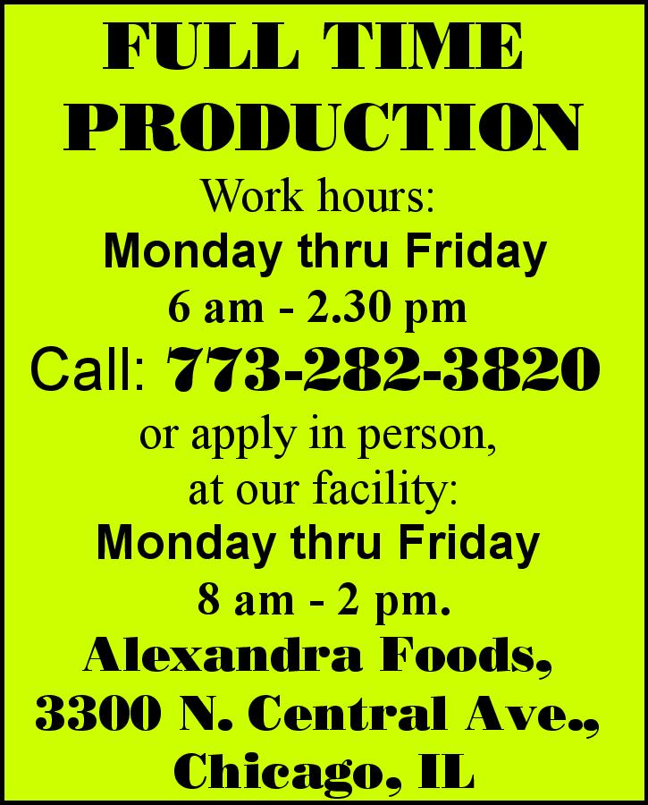 FULL TIME PRODUCTION Work hours: Monday thru Friday 6 am - 2.30 pm Call: 773-282-3820 or apply in person, at our facility: Monday thru Friday 8 am - 2 pm. Alexandra Foods, 3300 N. Central Ave., Chicago, IL