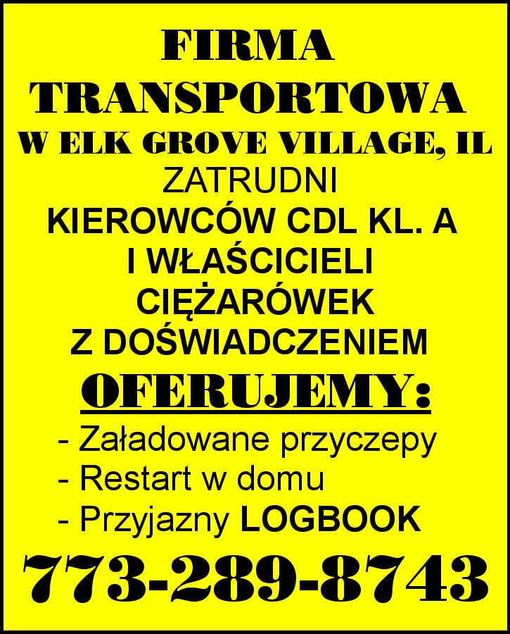 FIRMA TRANSPORTOWA W ELK GROVE VILLAGE, IL ZATRUDNI KIEROWCÓW CDL KL. A I WŁAŚCICIELI CIĘŻARÓWEK Z DOŚWIADCZENIEM. OFERUJEMY: - Załadowane przyczepy - Restart w domu - Przyjazny LOGBOOK 773-289-8743