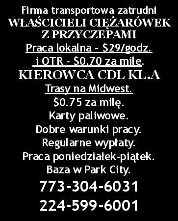 Firma transportowa zatrudni WŁAŚCICIELI CIĘŻARÓWEK Z PRZYCZEPAMI. Praca lokalna - $29/godz. i OTR - $0.70 za milę. KIEROWCA CDL KL. A Trasy na Midwest. $0.75 za milę. Karty paliwowe. Dobre warunki pracy. Regularne wypłaty. Praca od poniedziałku do piątku. Baza w Park City. 773-304-6031 224-599-6001