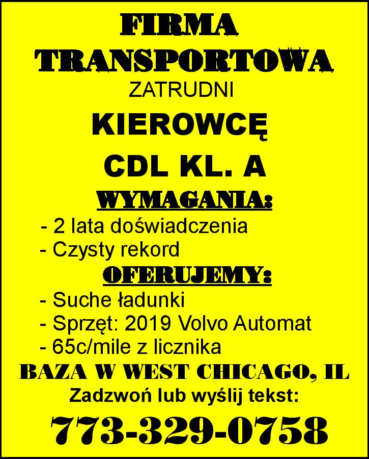 FIRMA TRANSPORTOWA ZATRUDNI: KIEROWCĘ CDL KL. A WYMAGANIA: * 2 lata doświadczenia * Czysty rekord OFERUJEMY: - Suche ładunki - Sprzęt: 2019 Volvo Automat - 65c/mile z licznika BAZA W WEST CHICAGO, IL Zadzwoń lub wyślij tekst: 773-329-0758