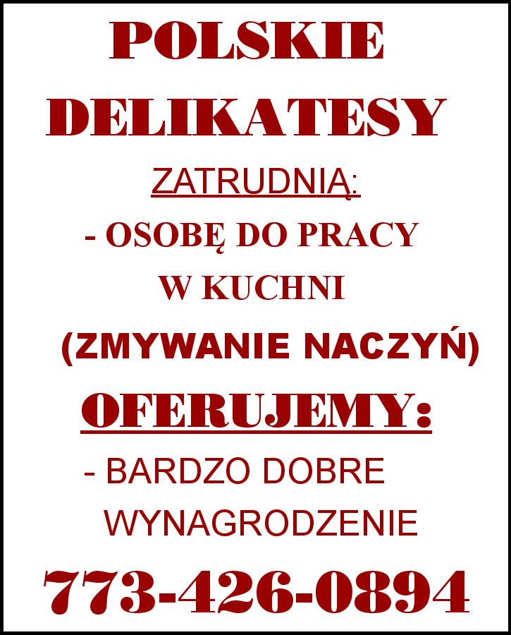 POLSKIE DELIKATESY ZATRUDNIĄ: - OSOBĘ DO PRACY W KUCHNI (ZMYWANIE NACZYŃ) OFERUJEMY: - BARDZO DOBRE WYNAGRODZENIE 773-426-0894