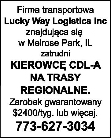 Firma transportowa Lucky Way Logistics Inc znajdująca się w Melrose Park, IL zatrudni KIEROWCĘ CDL-A NA TRASY REGIONALNE Zarobek gwarantowany $2400/tyg. lub więcej. 773-627-3034