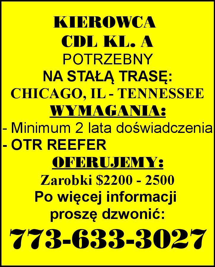 KIEROWCA CDL KL. A POTRZEBNY NA STAŁĄ TRASĘ: CHICAGO, IL - TENNESSEE WYMAGANIA: - Minimum 2 lata doświadczenia. OTR REEFER. OFERUJEMY: Zarobki $2200 - 2500 Po więcej informacji proszę dzwonić: 773-633-3027