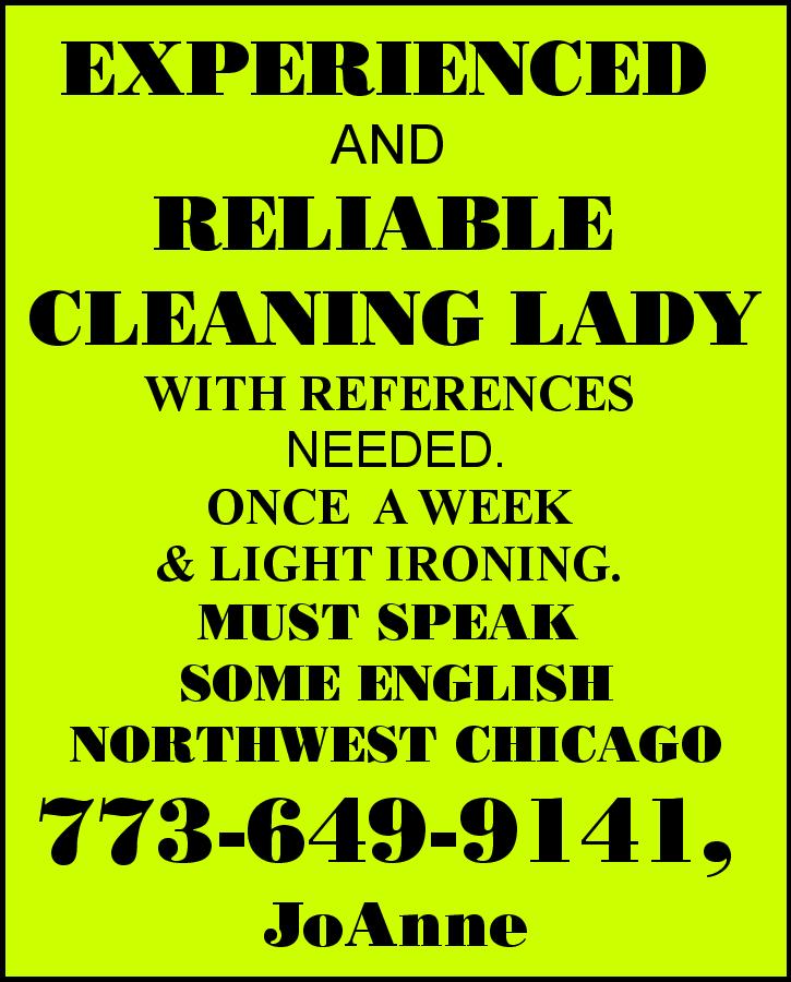 EXPERIENCED AND RELIABLE CLEANING LADY WITH REFERENCES NEEDED. ONCE A WEEK & LIGHT IRONING. MUST SPEAK SOME ENGLISH. NORTHWEST CHICAGO. 773-649-9141, JoAnne