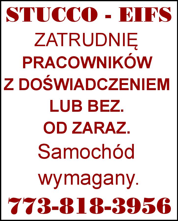 STUCCO - EIFS ZATRUDNIĘ PRACOWNIKÓW Z DOŚWIADCZENIEM LUB BEZ. OD ZARAZ. Samochód wymagany. 773-818-3956