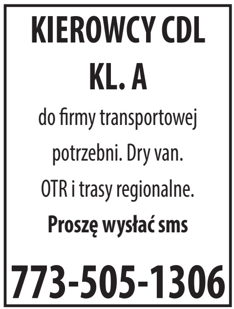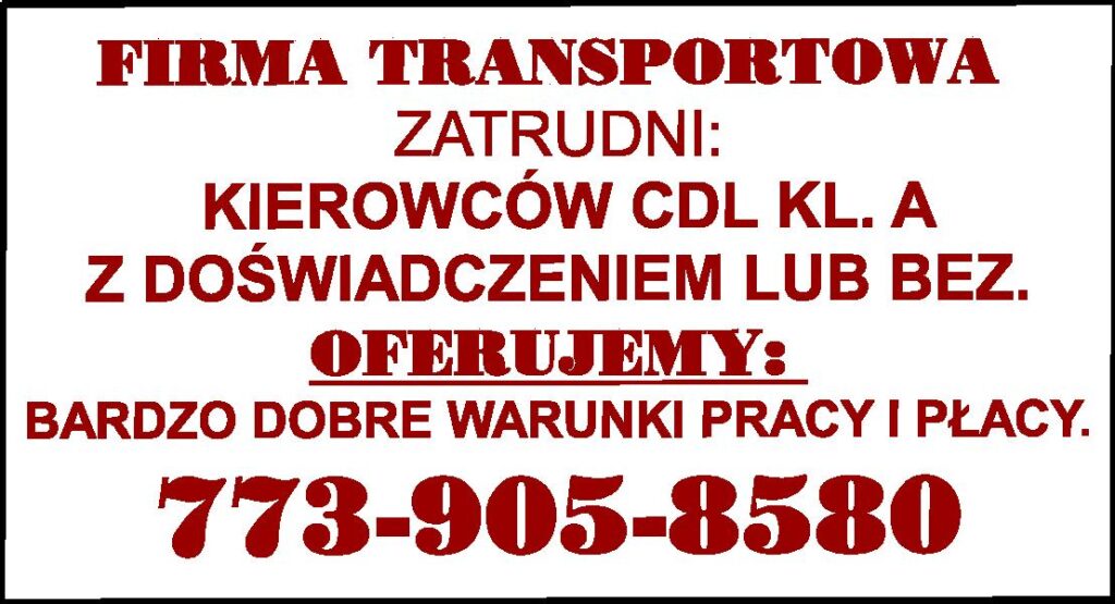 FIRMA TRANSPORTOWA ZATRUDNI: KIEROWCÓW CDL KL. A, Z DOŚWIADCZENIEM LUB BEZ. OFERUJEMY: BARDZO DOBRE WARUNKI PRACY I PŁACY. 773-905-8580