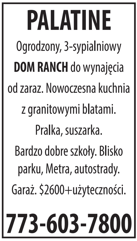Ogrodzony, 3-sypialniowy DOM RANCH do wynajęcia od zaraz. Nowoczesna kuchnia z granitowymi blatami. Pralka, suszarka. Bardzo dobre szkoły. Blisko parku, Metra, autostrady. Garaż. $2600+użyteczności. 773-603-7800