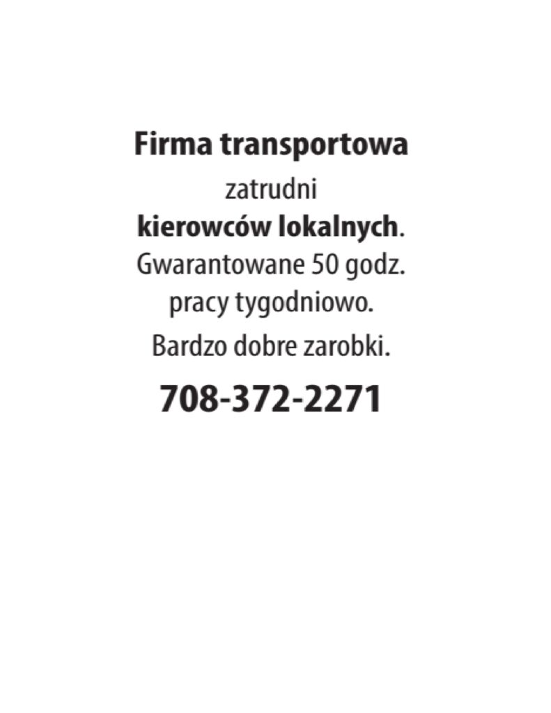 FIRMA W WEST CHICAGO, IL ZATRUDNI KIEROWCĘ CDL KL. A. Trasy: MN, MI, TX Doświadczenie wymagane. Stała praca, weekendy w domu. Możliwość pracy bez ELD. 847-848-1357 773-691-4107