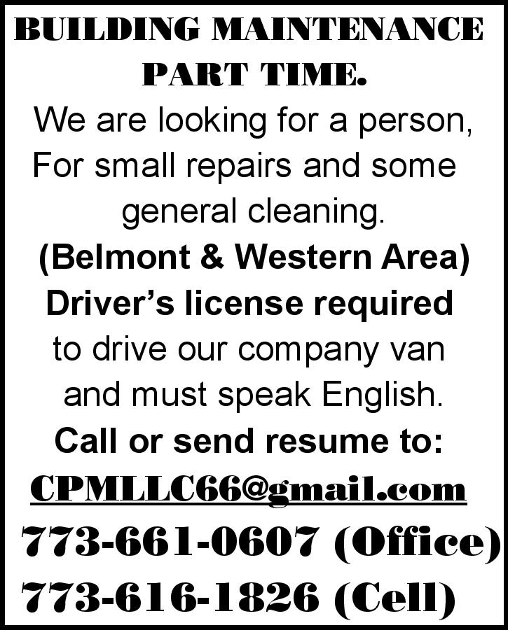 na popołudniową zmianę potrzebny. Pół etatu (4-8 godzin dziennie). 847-305-3777