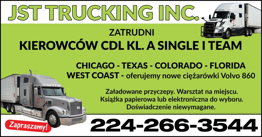 JST TRUCKING ZATRUDNI: KIEROWCÓW CDL KL. A SINGLE I TEAM CHICAGO - TEXAS - COLORADO WEST COAST- oferujemy nowe ciężarówki Volvo 860. Załadowane przyczepy. Warsztat na miejscu. Książka papierowa lub elektroniczna do wyboru. Doświadczenie niewymagane. ZAPRASZAMY! 224-266-3544