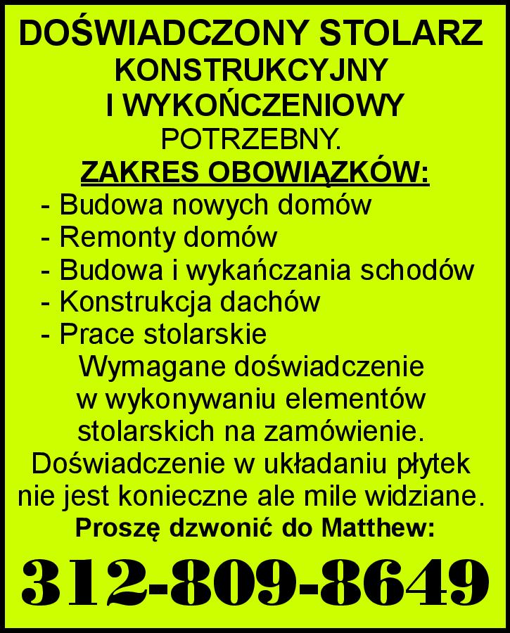 POMOCNIK STOLARZA MEBLOWEGO potrzebny w Wheeling, IL 773-954-9065, Rafał 773-983-1340, Przemek