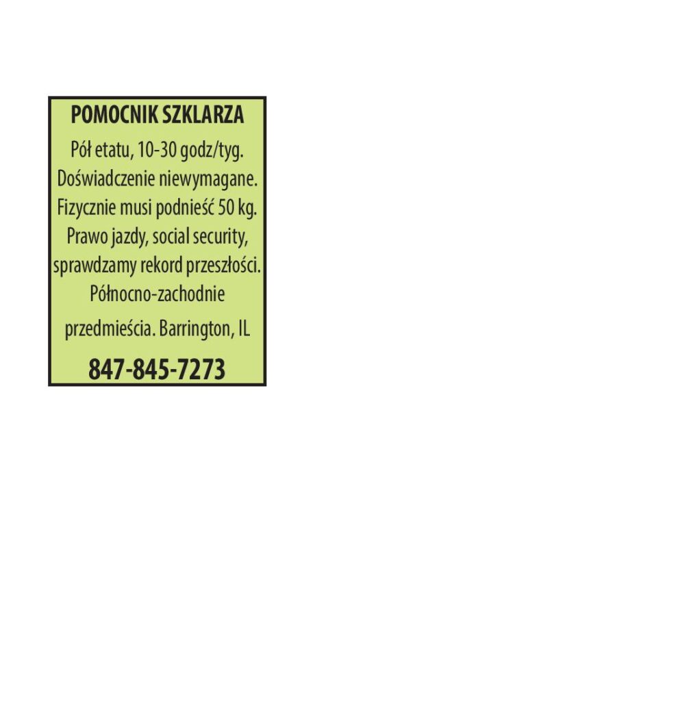 Fabryka w Harwood Heights zatrudni MONTERA/MACHINE ASSEMBLER do pracy fabrycznej. Doświadczenie mile widziane. Praca na cały etat. Stawka zależna od doświadczenia. Oferujemy: pełne ubezpieczenie, plan 401k, płatne wakacje i podstawowe święta, dni chorobowe. Proszę zglaszać sie osobiści […]