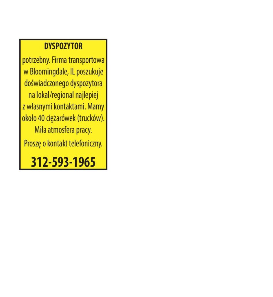 DYSPOZYTOR potrzebny. Firma transportowa w Bloomingdale, IL poszukuje doświadczonego dyspozytora na lokal/regional najlepiej z własnymi kontaktami. Mamy około 40 ciężarówek (trucków). Miła atmosfera pracy. Proszę o kontakt telefoniczny. 312-593-1965