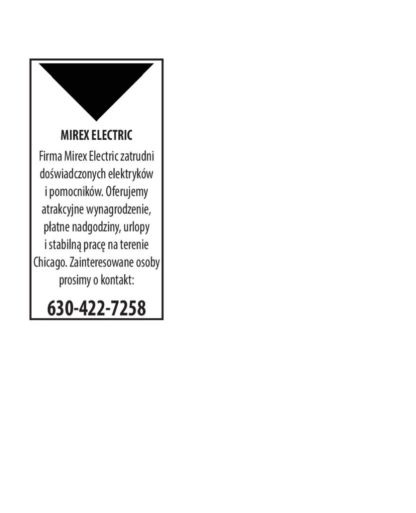 MIREX ELECTRIC Firma Mirex Electric zatrudni doświadczonych elektryków i pomocników. Oferujemy atrakcyjne wynagrodzenie, płatne nadgodziny, urlopy i stabilną pracę na terenie Chicago. Zainteresowane osoby prosimy o kontakt: 630-422-7258