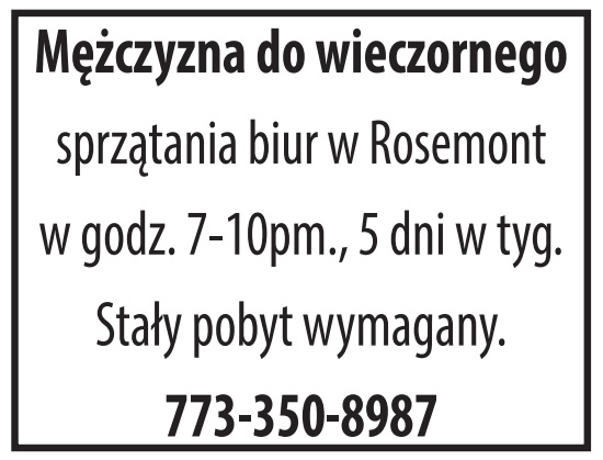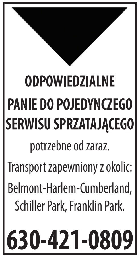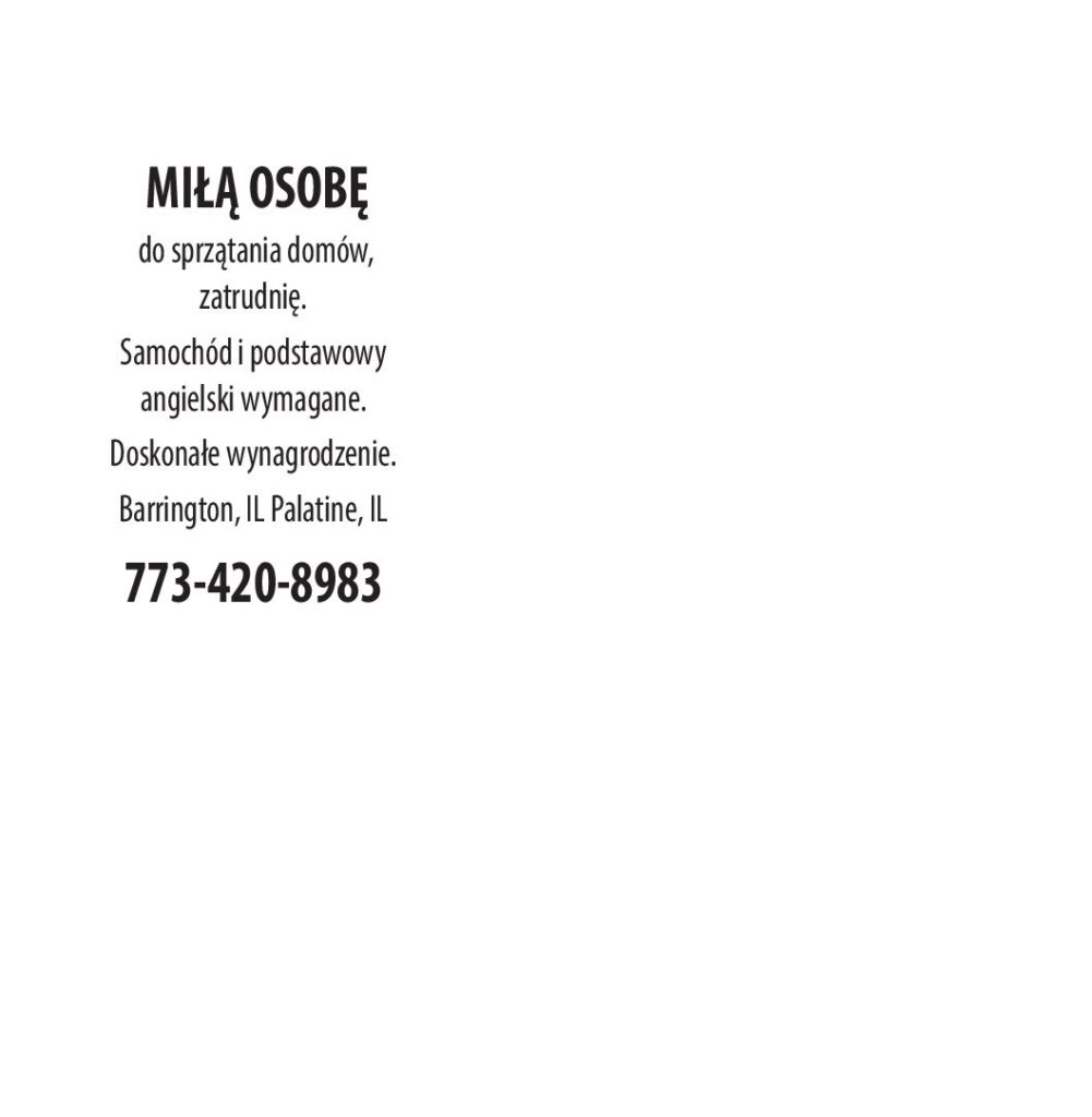PALATINE, IL Sprzątanie 4 dni w tygodniu, (wtorki, środy, czwartki i piątki) w godz. 10 am-3 pm. Angielski do porozumienia wymagany. 224-678-1543