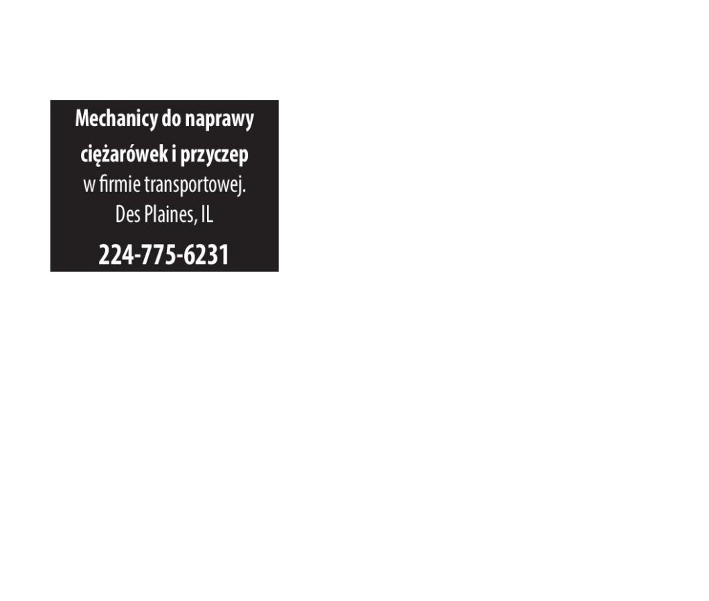 FIRMA TRANSPORTOWA W BRIDGEVIEW zatrudni MENEDŻERA WARSZTATU NAPRAWY CIĘŻARÓWEK. Doświadczenie w zarządzaniu ludźmi i warsztatem konieczne. 708-940-2089 Dzwoń 8 am - 4.30 pm od pon. do pt.