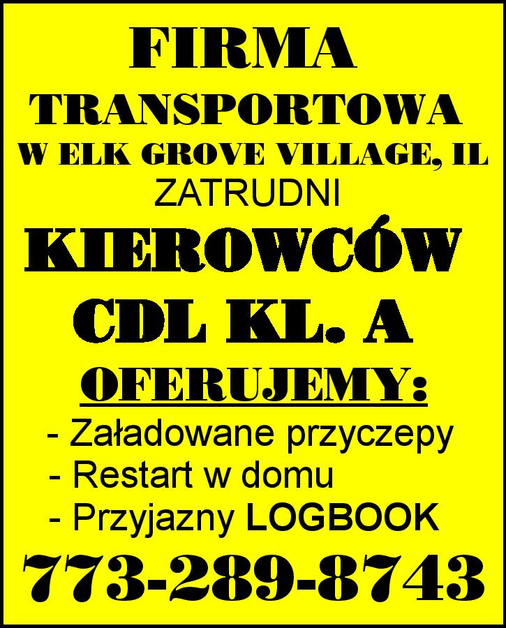 FIRMA TRANSPORTOWA W ELK GROVE VILLAGE, IL ZATRUDNI KIEROWCÓW CDL KL. A OFERUJEMY: - Załadowane przyczepy - Restart w domu - Przyjazny LOGBOOK - Bardzo dobre wynagrodzenie 773-289-8743