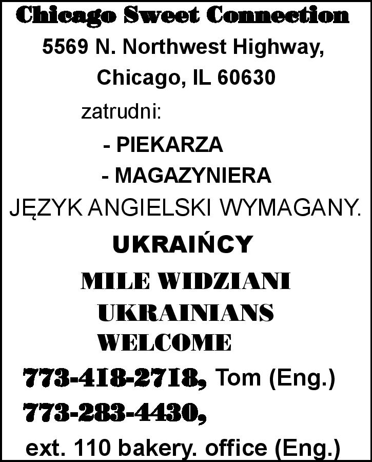Chicago Sweet Connection 5569 N. Northwest Highway, Chicago, IL 60630 zatrudni: - PIEKARZA - MAGAZYNIERA JĘZYK ANGIELSKI WYMAGANY. UKRAIŃCY MILE WIDZIANI. UKRAINIANS WELCOME. 773-418-2718, Tom (Eng.) 773-283-4430, ext 110 bakery, office (Eng.)