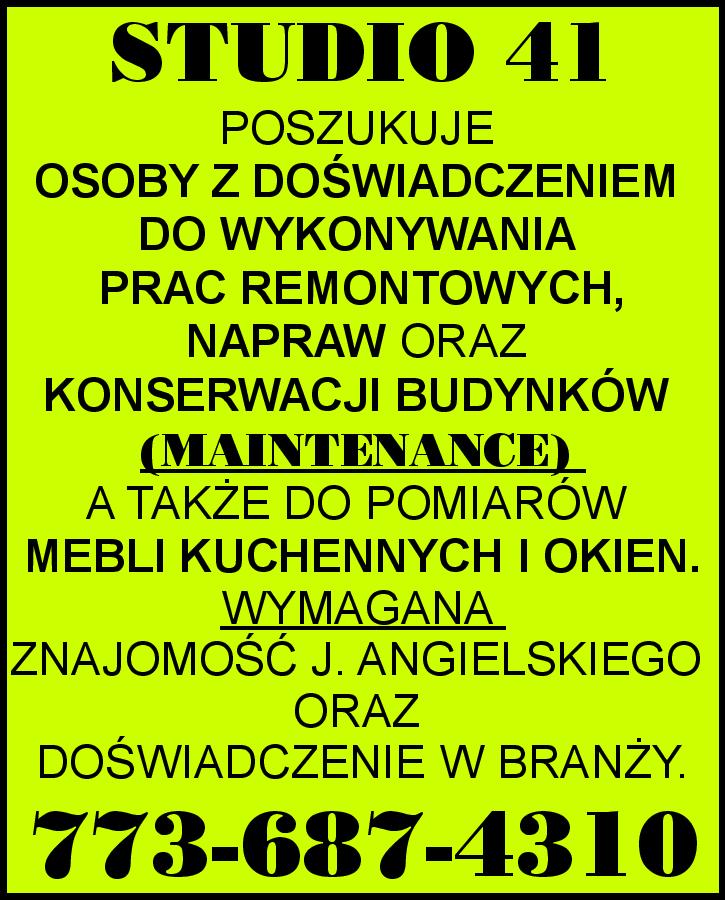 STUDIO 41 POSZUKUJE OSOBY Z DOŚWIADCZENIEM DO WYKONYWANIA PRAC REMONTOWYCH, NAPRAW ORAZ KONSERWACJI BUDYNKÓW ( MAINTENANCE) A TAKŻE DO POMIARÓW MEBLI KUCHENNYCH I OKIEN. WYMAGANA ZNAJOMOŚĆ J. ANGIELSKIEGO ORAZ DOŚWIADCZENIE W BRANŻY. 773-687-4310