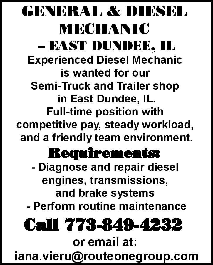MECHANIK SAMOCHODÓW CIĘŻAROWYCH (DIESEL), POTRZEBNY. GLENVIEW, IL NARZĘDZIA NIEWYMAGANE. Minimum $23/godz. i więcej (gotówką), w zależności od umiejętności. Dzwoń lub wyślij SMS. 773-372-2623