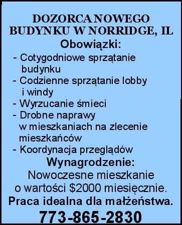 Obowiązki: - Cotygodniowe sprzątanie budynku - Codzienne sprzątanie lobby i windy - Wyrzucanie śmieci - Drobne naprawy w mieszkaniach na zlecenie mieszkańców - Koordynacja przeglądów Wynagrodzenie: Nowoczesne mieszkanie o wartości $2000 miesięcznie. Praca idealna dla małżeństwa. 773-865-2830