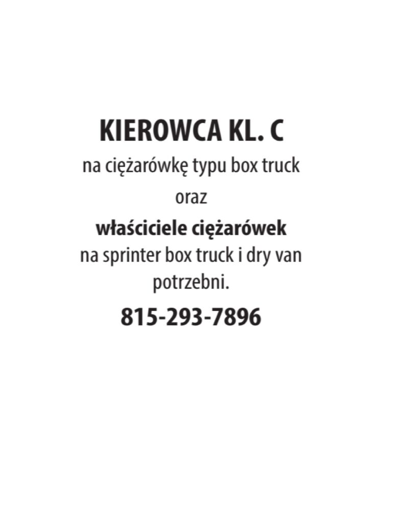 KIEROWCĘ KL. C Z DOŚWIADCZENIEM ZATRUDNIMY DO TRANSPORTU SAMOCHODÓW. WYMAGANIA: - Komunikatywny j. angielski - Prawo jazdy KL. C OFERUJEMY: - Dobre zarobki - Codziennie w domu Proszę dzwonić: 773-964-2921