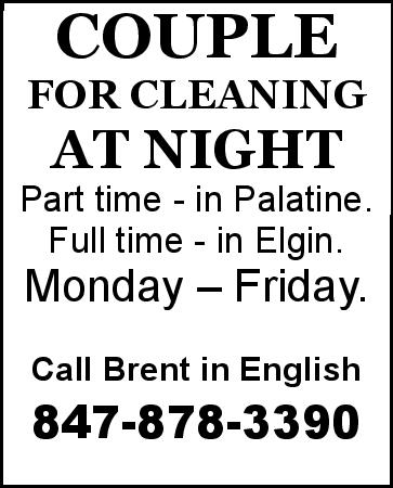 Part time - in Palatine. Full time - in Elgin. Monday - Friday. Call Brent in English 847-878-3390
