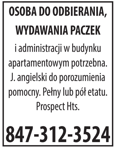 i administracji w budynku apartamentowym potrzebna. J. angielski do porozumienia pomocny. Pełny lub pół etatu. Prospect Hts. 847-312-3524