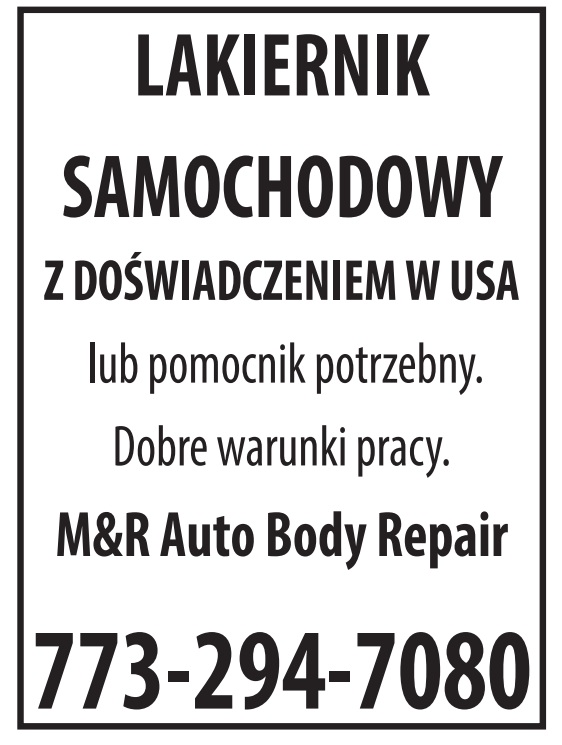 lub pomocnik potrzebny. Dobre warunki pracy. M&R Auto Body Repair 773-294-7080