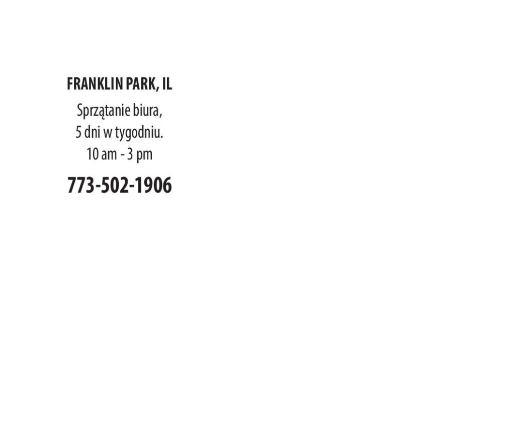 WIECZORNE SPRZĄTANIE BIUR DLA PARY (KOBIETA I MĘŻCZYZNA). PRACA NA PEŁNY LUB PÓŁ ETATU. DOŚWIADCZENIE WYMAGANE. OKOLICE ADDISON, IL 847-877-8778