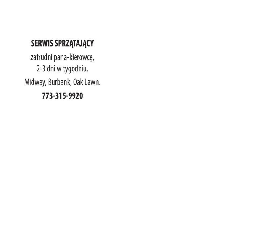 SERWIS SPRZĄTAJĄCY zatrudni pana-kierowcę, 2-3 dni w tygodniu. Midway, Burbank, Oak Lawn. 773-315-9920