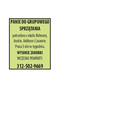PANIE DO GRUPOWEGO SPRZĄTANIA potrzebne z okolic Belmont, Austin, Addison i Laramie. Praca 5 dni w tygodniu. WYSOKIE ZAROBKI WCZESNE POWROTY. 312-502-9669