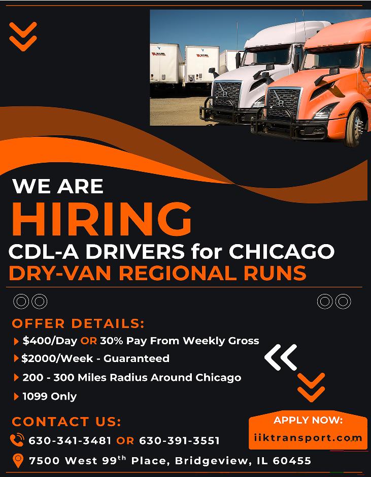 WE ARE HIRING CDL-A DRIVERS for CHICAGO DRY-VAN REGIONAL RUNS OFFER DETAILS: $400/Day OR 30% Pay From Weekly Gross $2000/Week - Guaranteed 200 - 300 Miles Radius Around Chicago 1099 Only CONTACT US: 630-341-3481 OR 630-391-3551 7500 West 99th Place, Bridgeview, IL 60455 APPLY NOW: iiktransport.com