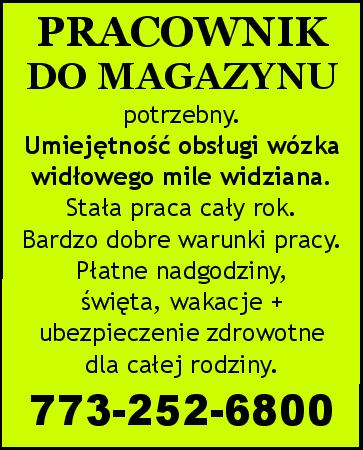 potrzebny. Umiejętność obsługi wózka widłowego mile widziana. Stała praca cały rok. Bardzo dobre warunki pracy. Płatne nadgodziny, święta i wakacje + ubezpieczenie dla całej rodziny. 773-252-6800