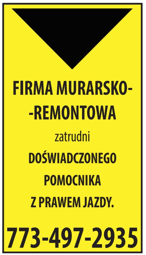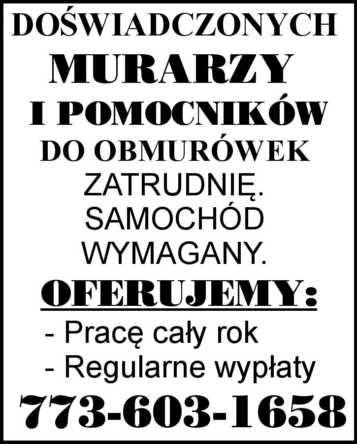 DOŚWIADCZONYCH MURARZY I POMOCNIKÓW DO OBMURÓWEK ZATRUDNIĘ. SAMOCHÓD WYMAGANY. OFERUJEMY: - Pracę cały rok - Regularne wypłaty 773-603-1658