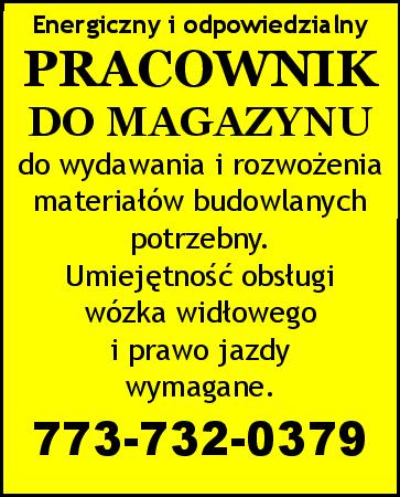 do wydawania i rozwożenia materiałów budowlanych potrzebny. Umiejętność obsługi wózka widłowego i prawo jazdy wymagane. 773-732-0379